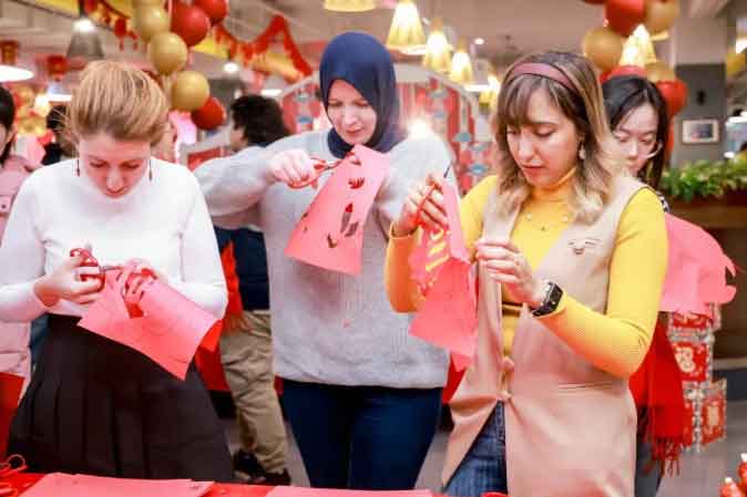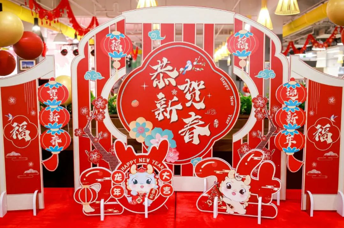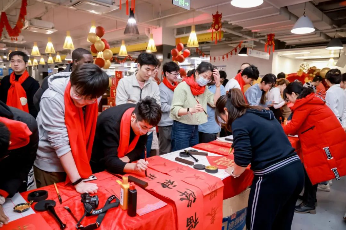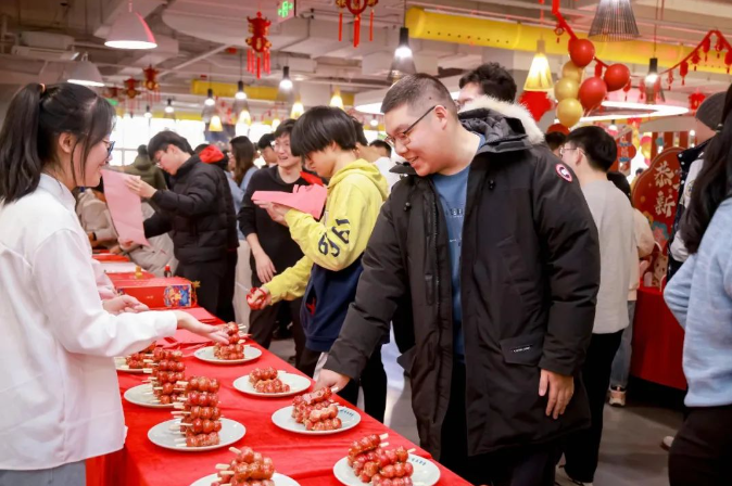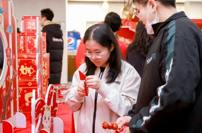 龙腾虎跃迎新年,欢声笑语贺新春,团圆宴活动现场张灯结彩、喜气洋洋。新春拼福板上写满了同学们的祝福和心愿,可爱的龙年吉祥物、火红的围巾和美味的零食大礼包装满新春福袋。“年味一条街”里人头攒动,巧手剪窗花,泼墨写春联,晶莹剔透的冰糖葫芦带来甜甜蜜蜜。