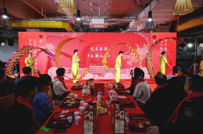 大家一边品尝着年味自助餐,一边欣赏着校团委艺术团同学和辅导员们精心准备的民乐表演《赛马》《喜洋洋》、舞蹈表演《Wonderful U》、武术表演《龙腾九霄》、歌曲演唱《相亲相爱》等节目,体验着丰富多彩的互动游戏。活动现场祝福不停、掌声不断,大家沉浸式体验年味十足的欢乐海洋。