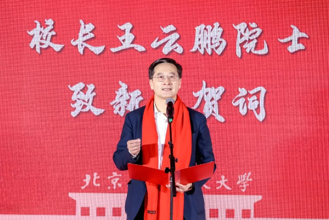 王云鹏在团圆宴上致新春贺词,他代表学校向大家致以节日的美好祝福,向全校师生员工拜年,祝大家新春愉快。他表示,回顾过去一年,在以习近平同志为核心的党中央坚强领导下,北航人团结一心、开拓进取,学校事业发展又迈上了新台阶。王云鹏用六个“新”回顾总结了2023年学校各项工作。他指出,过去一年,学校加快形成办学“新格局”,着力打造学科“新生态”,全力塑造科技创新“新能力”,积极推动师资队伍“新突破”,不断激发改革“新动能”,人才培养取得“新范式”。这些成绩是全体北航人一道拼出来、干出来、奋斗出来的,王云鹏代表学校对大家的辛勤付出表示衷心的感谢。