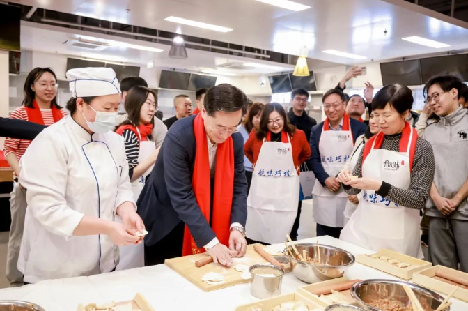 在包饺子现场,校领导和同学们一起参与到热火朝天的活动中,和面、拌馅、擀皮,在亲切的问候与暖心的家常话中包出一个个充满年味的团圆饺子,让同学们体会年的味道、感受家的温暖。
