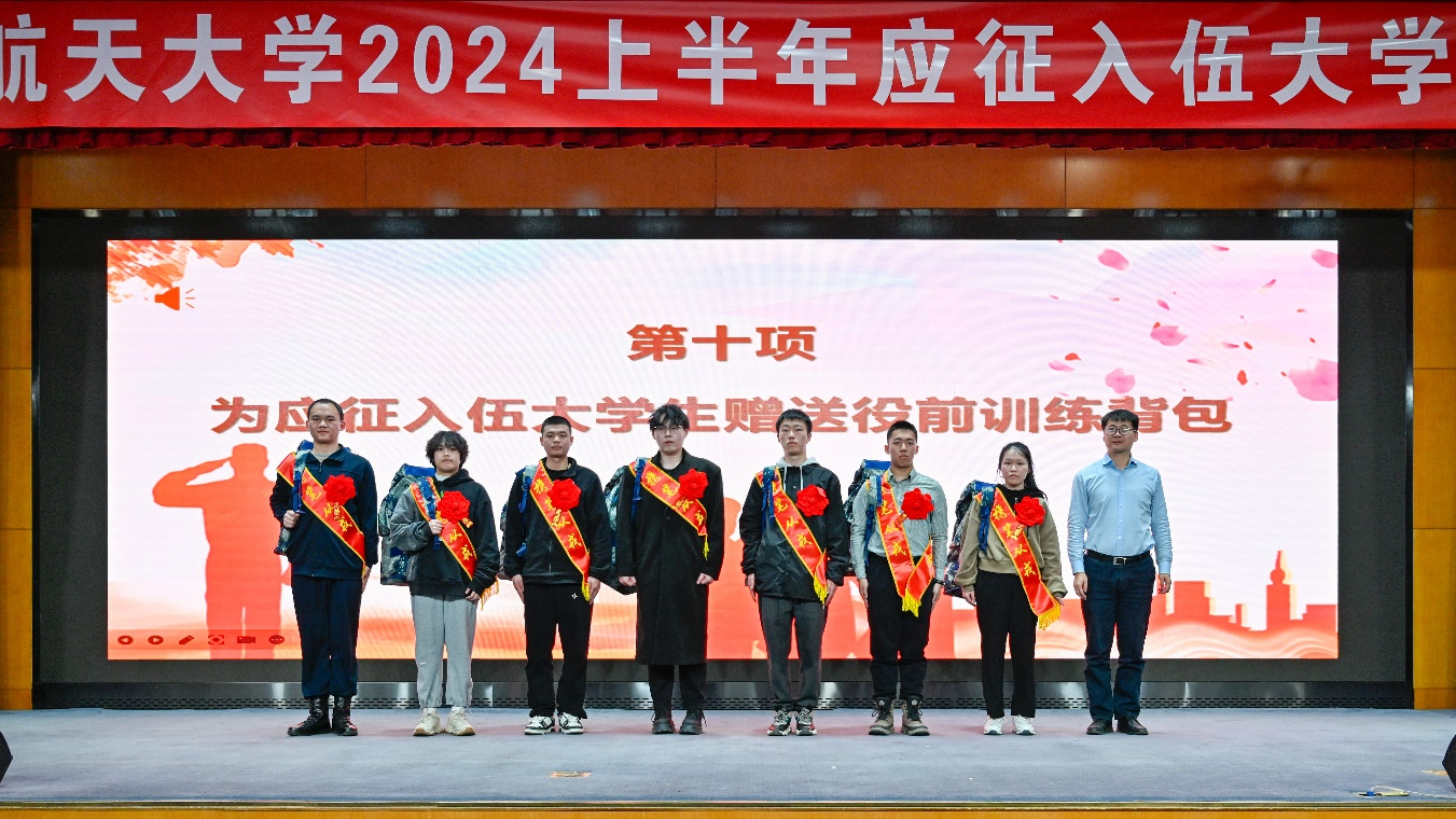 会议最后,相关学院老师为退役大学生士兵代表、应征入伍大学生佩戴绶带、红花,党委武装部宋晓东向应征入伍大学生赠送役前训练背包。