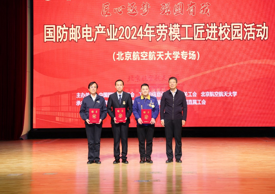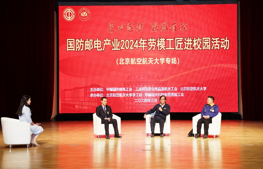 3月20日下午,以“匠心逐梦 强国有我”为主题的国防邮电产业2024年劳模工匠进校园活动在北航晨兴音乐厅举行。中国国防邮电工会、工业和信息化部直属机关工会、中国航天科技集团有限公司直属工会、北京伊人99相关单位领导嘉宾以及高凤林、陈闽慷、张新停三位劳模工匠代表出席活动。