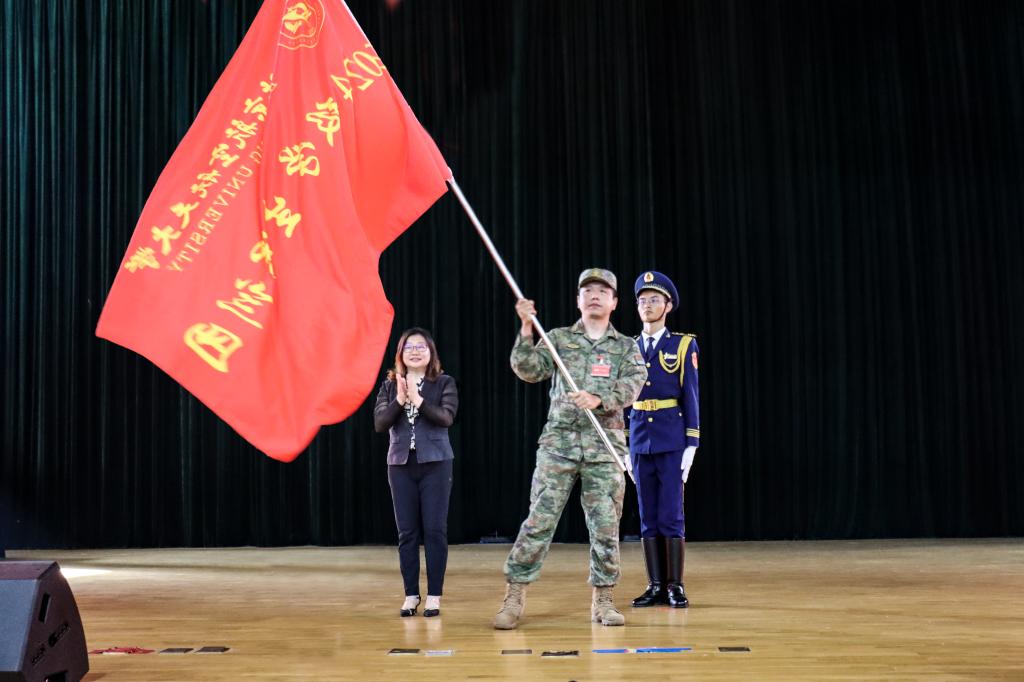 邓怡为军训团授旗并作动员讲话。她回顾了北航作为新中国第一所航空航天高等学府的光辉历程,强调学校从航空救国到航空报国、航天报国,再到服务航空强国、航天强国建设的道路上,始终传承红色基因,把服务国家作为最高追求。邓怡对全体参训学员提出了三点期望:一是要涵养忠诚品格,在信仰历练中彰显家国情怀,用实际行动去传承以“空天报国”为内核的北航精神;二是要培育顽强毅力,在逆境考验中塑造坚韧心性,学会在困境中保持冷静与乐观,为未来的大学生活打下坚实基础;三是要强化集体意识,在团结协作中铸就军人荣耀,学会在协作中寻求共赢,在互助中共同成长,共同打造一支坚不可摧的铁血军团。她希望各位同学经过军训的历练,不仅能够锻炼身体、磨练意志,更能够深刻领悟到作为新时代北航学子的责任与担当。