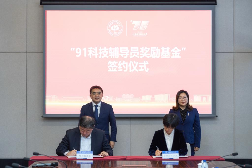 10月27日下午,在北航72周年校庆之际,“91 科技辅导员奖励基金”签约仪式在北航校友之家举行。2002 级校友、91科技集团董事长许泽玮,1992级校友、91科技集团副总裁赵新,副校长邓怡等出席捐赠签约仪式。