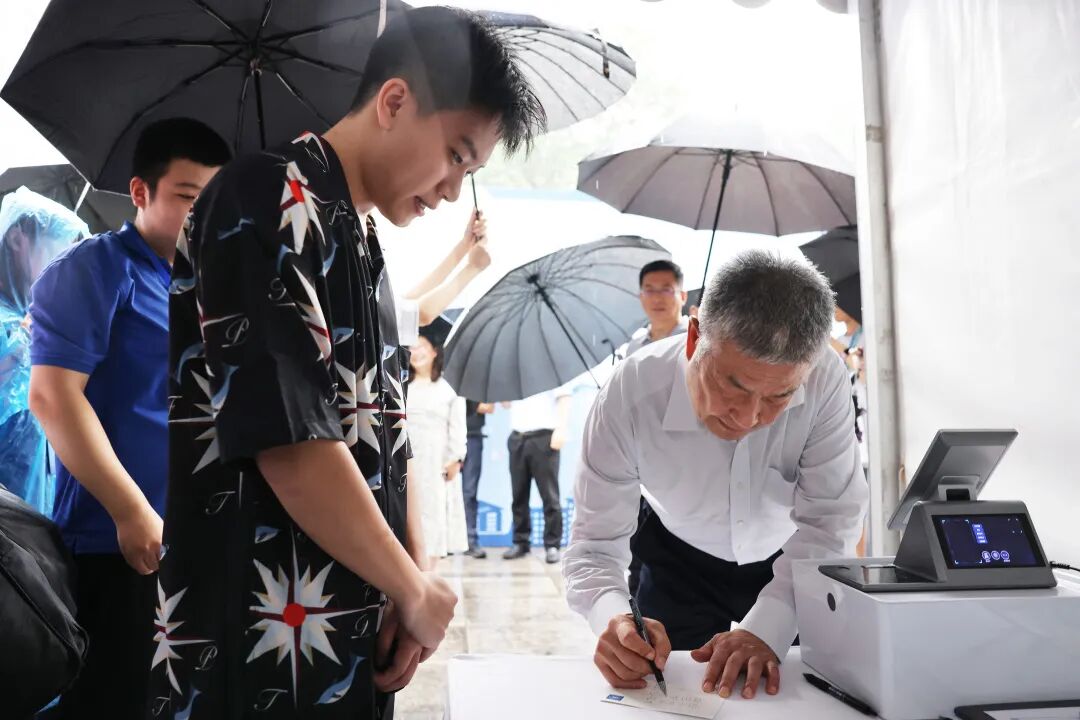 上午,迎新进程过半,一场喜雨降临,雨中报到依然有序,各项服务热情不减。